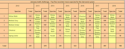 Macros - As can be seen in the chart below several people managed to record 3 species. Across all recorders the most numerous species was the Winter Moth with. Once again the Mottled Umber came second with 31 moths and the Mottled Grey was third with 26 moths.The most moths recorded by individual recorders was 125 by myself, Sue 32 and Julie/Mark 21.Of the 11 species recorded, none were totally unexpected, although the Pale Pinion and Spruce Carpet are always good January records.